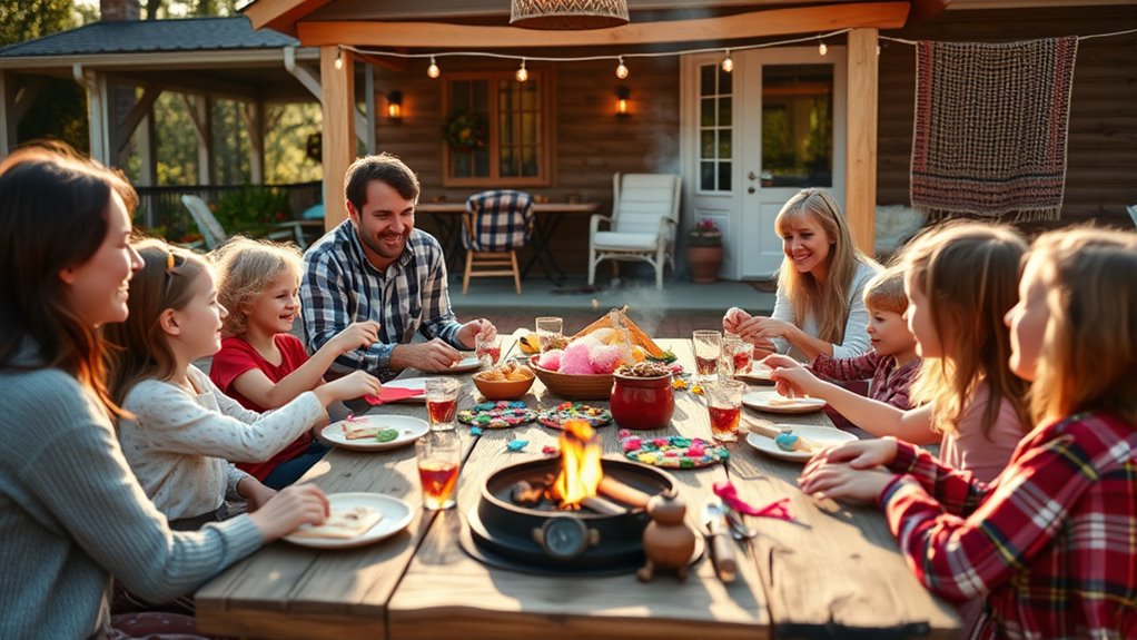 You can create affordable family traditions by focusing on budget-friendly activities like weekly game nights or outdoor picnics, which don’t cost much but foster connection. Simple holiday customs, such as baking cookies together or decorating your home, make lasting memories without overspending. These traditions fit into busy schedules, are easy to start, and help build a warm family culture you’ll cherish for years to come.