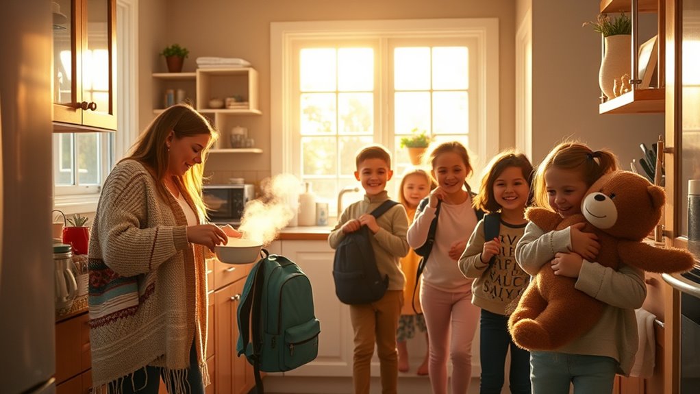 You can reduce morning stress by starting with family bonding activities like a quick morning meditation to calm everyone’s minds. Keep mornings organized by prepping clothes and lunches the night before, and create a simple, consistent routine everyone follows. Incorporate gentle wake-up times, and take a few minutes together to set positive intentions. These steps foster connection, reduce chaos, and set a peaceful tone for the day ahead.