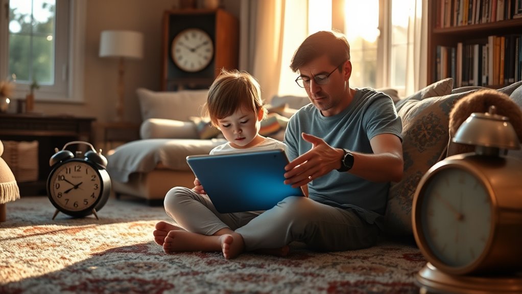 Balancing screen time during family activities is essential for fostering meaningful connections. To promote family bonding, create designated tech-free zones where screens are put away, like during meals or game nights. These zones encourage everyone to engage fully with each other, making conversations more natural and enjoyable. When planning family outings or activities, set clear expectations about screen usage beforehand. Use positive reinforcement to highlight moments when everyone stays present without devices. Remember, the goal isn’t to eliminate screens completely but to guarantee they don’t interfere with quality time. By intentionally carving out tech-free moments, you help your kids develop healthier habits and stronger relationships, making family time more fulfilling and memorable for everyone involved.