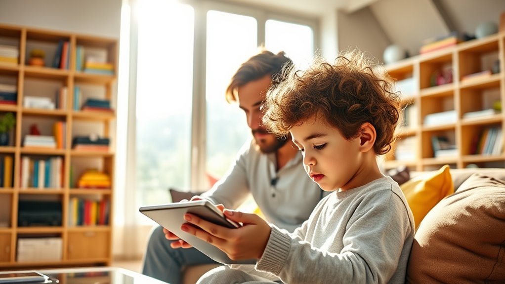 As a parent, modeling healthy screen habits is one of the most effective ways to teach your child about balanced usage. Children watch and imitate your behavior, so demonstrate moderation with screen time and device sharing. Set clear boundaries by designating screen-free zones and times, like during meals or before bed. Keep devices out of reach during family interactions to promote engagement. Use shared devices together, turning screen time into quality time. Encourage your child to balance online activities with offline play and learning. Establish rules like limiting continuous screen time and taking regular breaks. Additionally, understanding the importance of balanced usage in digital habits can help your child develop a healthier relationship with technology. Incorporating smart features such as timers and usage monitors can assist in maintaining these boundaries effectively. Recognizing the significance of digital well-being can further foster responsible technology habits. By setting these boundaries and showing self-control, you help your child develop healthy habits that will last a lifetime. Implementing consistent routines around device use can reinforce these healthy practices and promote stability. Regularly discussing digital health with your child can also promote awareness of the importance of mental and emotional well-being in the digital age.