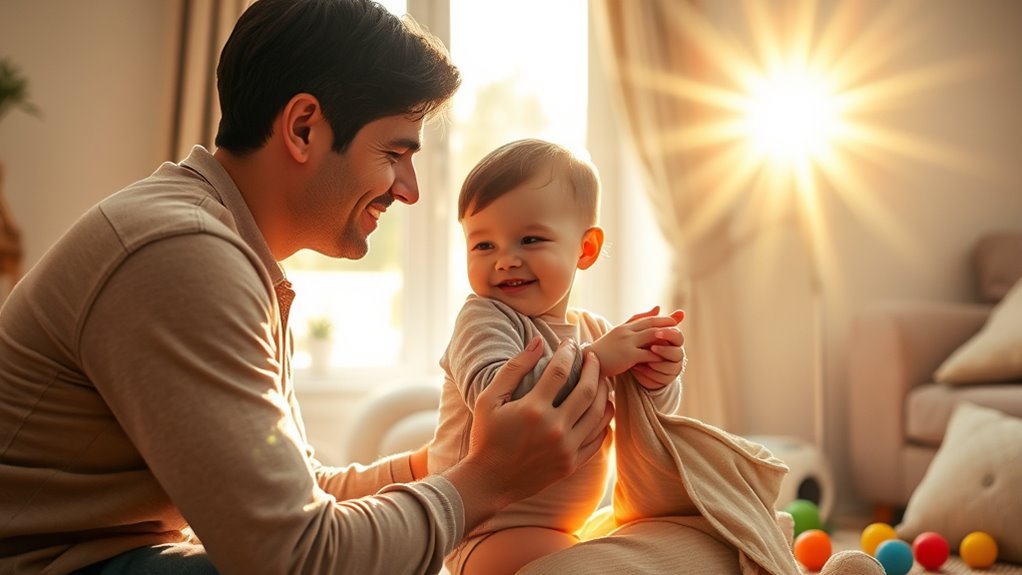 Modeling healthy emotional expression is essential because children learn how to manage their feelings by watching the adults around them. When you demonstrate emotional honesty, you show that it’s okay to feel a range of emotions and express them appropriately. Use an expressive vocabulary to describe your feelings clearly, such as saying, “I’m feeling frustrated” or “I’m happy because.” This helps your child understand emotions better and develop their own emotional awareness. Be mindful of how you handle your emotions; showing calmness and honesty teaches resilience and healthy coping skills. When children see you openly express your feelings in a respectful way, they learn that emotional honesty is valuable and that expressing feelings is a natural part of life. Incorporating safe sleep environments into your routines can also support your child’s sense of security and emotional stability. Additionally, modeling emotional regulation helps children learn how to manage their feelings during challenging situations, and practicing consistent routines reinforces emotional consistency and trust. Recognizing positive emotional expressions in your interactions can further encourage your child to communicate their feelings openly and confidently.