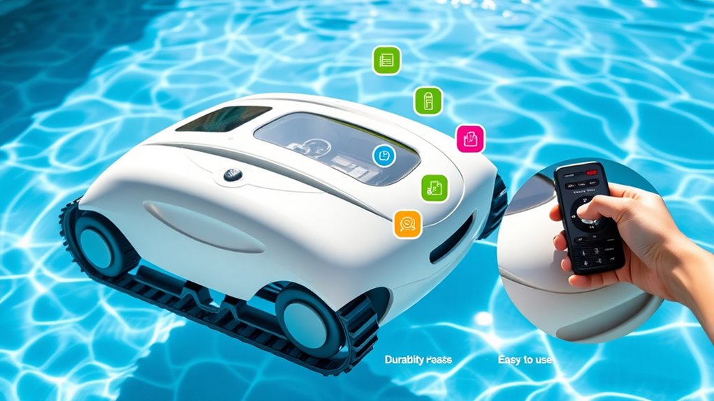 Understanding the importance of cost-effective maintenance can help you choose a model that balances affordability with performance. Beyond costs, you should evaluate the cleaning capabilities of the robot. Different models have varying coverage areas, navigational systems, and brush types, which impact how thoroughly they clean your pool. If your pool is large or has complex shapes, opt for a model with advanced navigation technology that maps out the space, avoiding missed spots and reducing cleaning time. For pools with a lot of debris, a robot with a larger filter capacity or multiple filtration stages will be more effective at keeping the water clear and free of dirt. Additionally, some models incorporate smart navigation features that improve efficiency and reduce cleaning time by intelligently planning their routes. These features are a result of technological advancements that continue to evolve in robotic pool cleaners, making them more reliable and efficient. Research on robotic pool cleaner technologies shows that these features significantly enhance cleaning performance. Ease of use is another key factor. Look for features like programmable timers, remote controls, or smartphone apps that allow you to set cleaning schedules and monitor progress remotely. This convenience means you won’t have to manually start the robot or get into the pool to check its status. Maintenance should also be straightforward; removable filters that are easy to clean and replace save you time and hassle.
