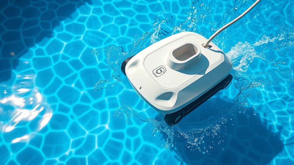 Suction pool cleaners are generally suitable for most pool sizes, but their pool size compatibility depends on the cleaner’s suction power efficiency. For larger pools, a powerful suction cleaner works best to cover the area effectively without taking too long. If your pool is small to medium, a standard suction cleaner will do the job well. Always check the manufacturer’s recommendations to guarantee ideal performance for your specific pool size.
