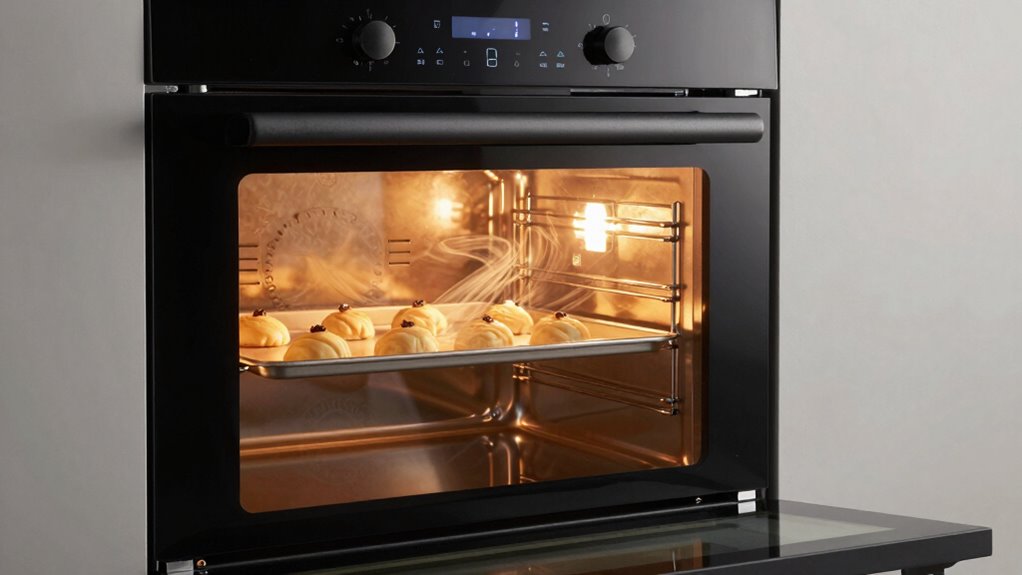 To effectively use convection mode, you should reduce your recipe’s temperature by about 25°F (15°C) to prevent over-browning, and make certain your oven racks are correctly positioned for proper airflow. Avoid overcrowding, and always preheat before switching to convection. Keep in mind it’s best for evenly baked cookies and roasted veggies but not delicate items like soufflés. If you want to master these techniques, there’s more to uncover about making convection work for you.