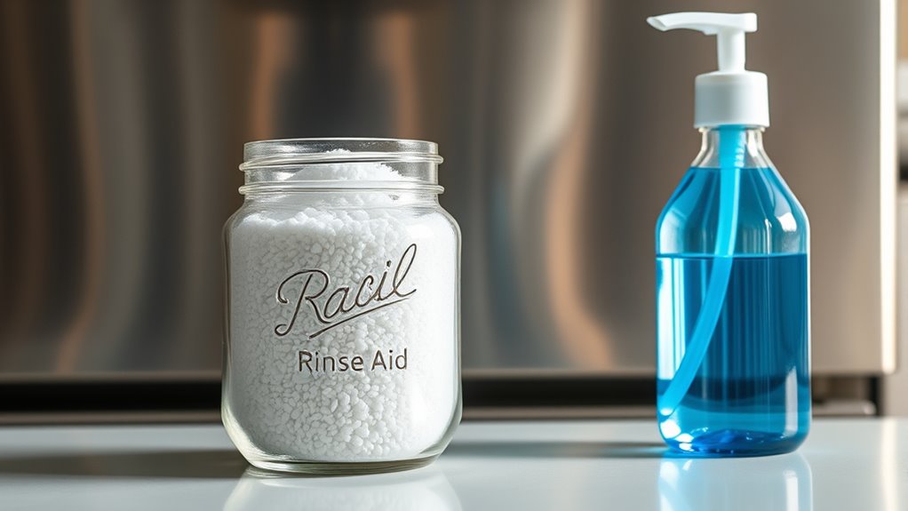 If you want your dishwasher to perform its best, understanding the roles of dishwasher salt and rinse aid is vital. These two products work together to improve your dishwasher’s efficiency, protect your appliance, and guarantee your dishes come out spotless. Dishwasher salt primarily focuses on water softening, which is essential if you have hard water. Hard water contains high mineral levels like calcium and magnesium, which can cause limescale buildup inside your machine and leave spots on your dishes. By using dishwasher salt, you help your appliance’s built-in water softener regenerate properly, reducing mineral deposits and preventing scale buildup. This not only extends the lifespan of your dishwasher but also guarantees that your dishes come out cleaner and brighter. Additionally, proper water softening improves drying performance because soft water allows heat and detergents to work more effectively, resulting in faster, shinier drying with fewer water spots. Without enough salt, hard water can hinder both cleaning and drying, leaving you frustrated with streaked glasses and residual grime.