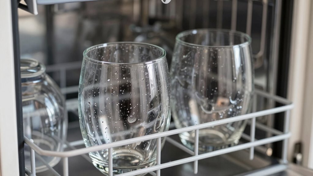 You should also examine your water hardness. Hard water contains minerals like calcium and magnesium that can leave deposits on your dishes, especially if your detergent isn’t formulated to handle hard water. In such cases, a water softening system or additional cleaning agents designed for hard water can help. Remember, understanding your water hardness levels can guide you in choosing the most effective solutions for your dishwasher. Regularly cleaning your dishwasher’s spray arms and filters guarantees that water flows freely and doesn’t leave behind mineral buildup.