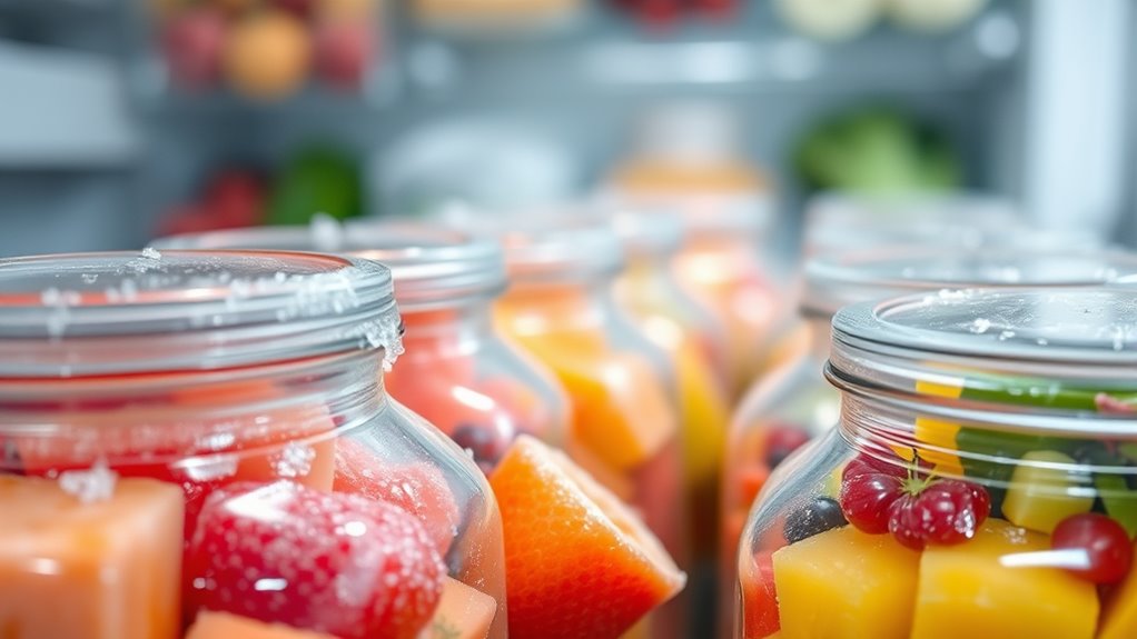 Imagine you’re freezing leftovers in silicone bags; they stay fresh longer because they’re airtight and flexible. Airtight containers and silicone bags are your best options for preventing freezer burn, as they seal out moisture and air. Silicone bags are especially convenient—they’re reusable and mold to your food’s shape. By choosing these, you create a barrier that helps keep your food fresh and free from freezer burn.