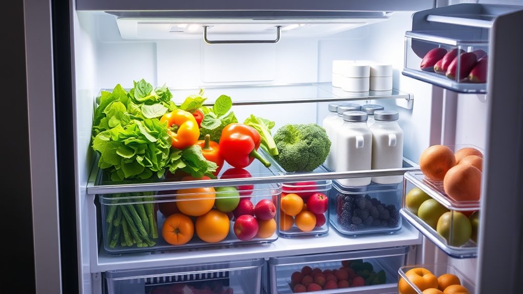 Once clean, divide your fridge into zones based on the types of food you store most often. For instance, designate a produce drawer for fruits and vegetables, a separate area for dairy products, and a shelf or bin for leftovers. By assigning specific spots, you reduce the chance of cross-contamination and keep everything accessible. This setup encourages better meal prep ideas because you’ll see what ingredients you have at a glance, making it easier to plan meals without overbuying or letting things spoil.