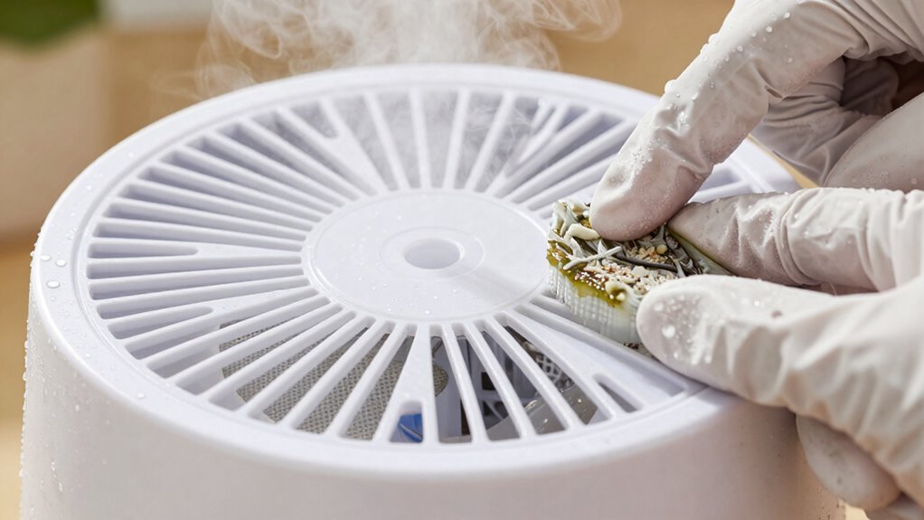 In addition to addressing mineral buildup, filter maintenance plays a critical role in preventing the growth of biofilm—those slimy, bacteria-laden layers that can thrive inside humidifiers. Regularly replacing or cleaning your filters ensures that airborne contaminants don’t circulate back into your room. Most filters need to be changed every one to three months, depending on usage and water quality. When you handle filters, check for signs of mold or discoloration, which indicate it’s time for a new one. Proper filter maintenance not only keeps your air clean but also prevents the spread of germs that can cause respiratory issues. Maintaining humidifier hygiene is essential for optimal performance and health safety.