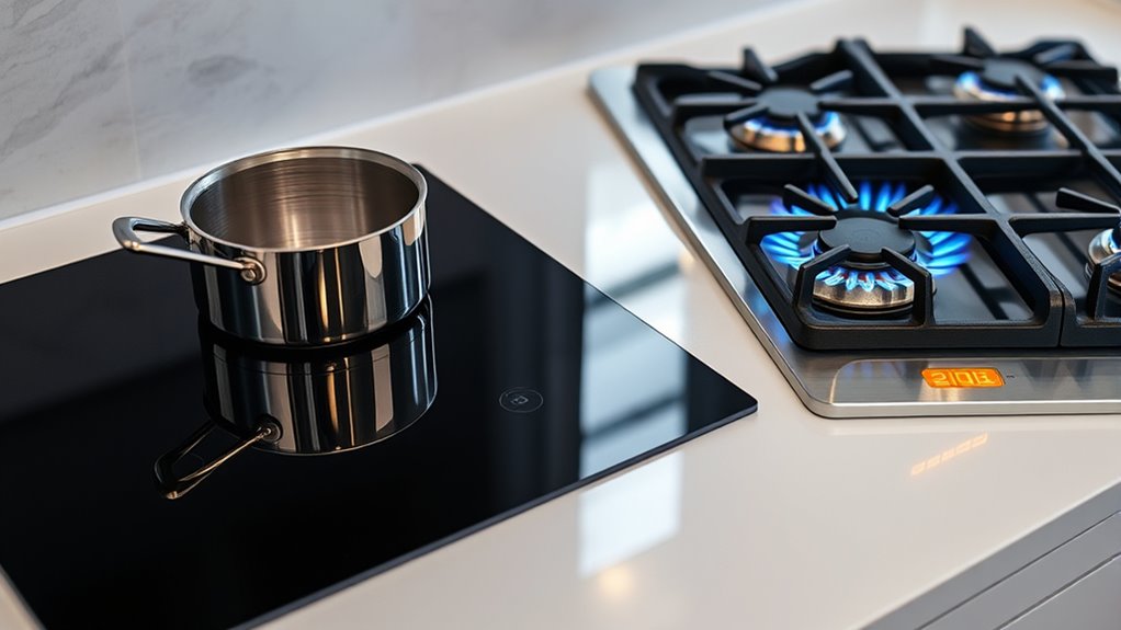 When choosing between induction and gas, consider safety and efficiency like weighing a delicate balance beam. Induction heats quickly and safely, like a lightning bolt, while gas offers a traditional, responsive touch. Think of it as finding the perfect fit for your kitchen’s rhythm—smooth and reliable or bold and classic. Whichever you pick, understanding their strengths helps you cook smarter, making your kitchen both safer and more efficient, just like a well-conducted symphony.