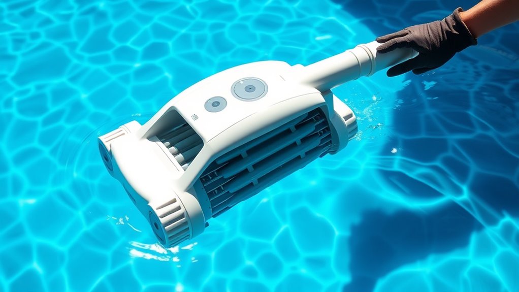Did you know regular maintenance boosts your suction pool cleaner’s efficiency by 30%? To keep it working well, you should check the filter regularly and perform filter maintenance to prevent clogs. Also, inspect the pump to ensure it runs smoothly and maintains proper suction. Cleaning the brushes and inspecting hoses help avoid wear and tear. These simple steps keep your cleaner effective and extend its lifespan.
