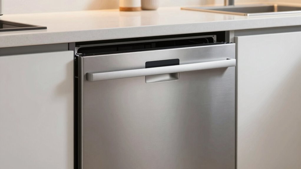 The placement of your dishwasher considerably impacts perceived noise through sound insulation and vibration dampening. If you install it on a solid, level surface away from living areas, you’ll notice less noise. Adding soundproof mats or insulation around the unit further reduces sound transmission. Also, placing the dishwasher on vibration-dampening pads can minimize vibrations that amplify noise, making your kitchen quieter and more comfortable during wash cycles.