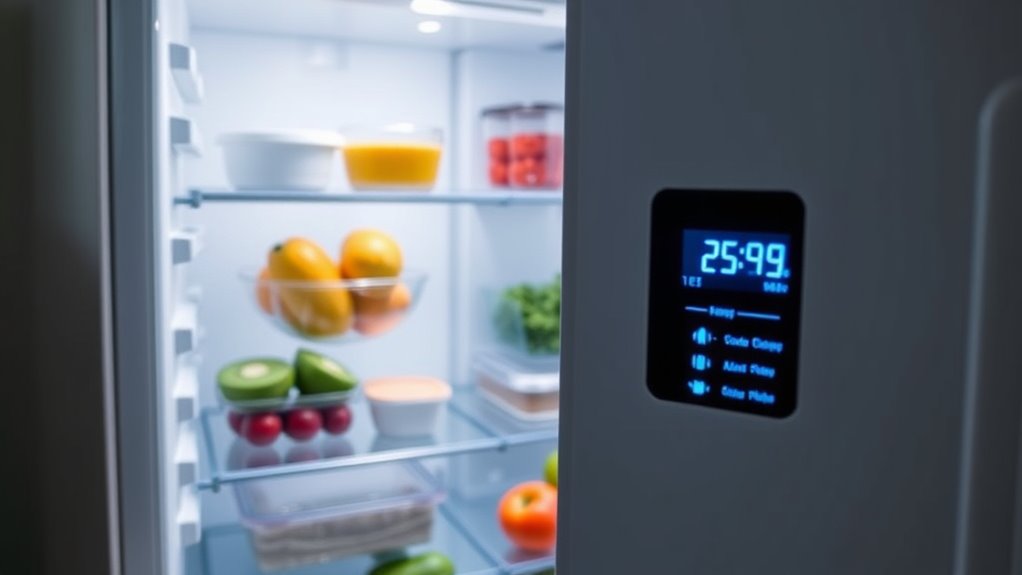 Maintaining the right refrigerator temperature is essential to keeping your food fresh and safe. When your fridge operates at the correct setting, you reduce the risk of bacteria growth and spoilage, making sure every item stays as fresh as possible. The recommended temperature for most refrigerators is around 37°F (3°C), with the freezer ideally set at 0°F (-18°C). Staying within these ranges ensures your food remains safe to consume while also supporting energy efficiency. When your fridge is too cold, you might be wasting energy and risking freezer burn on perishables. Conversely, if it’s too warm, bacteria can multiply quickly, leading to foodborne illnesses and waste. Proper temperature regulation not only safeguards food safety but also helps cut down on energy costs. When your refrigerator is set too cold, it has to work harder to maintain that temperature, which increases energy consumption and raises your utility bills. On the other hand, setting it too warm can cause your appliance to run excessively as it struggles to keep everything cool, also wasting energy. Finding that perfect balance allows your fridge to operate efficiently without overworking, saving you money and reducing your carbon footprint. You can easily check your refrigerator’s temperature with a simple thermometer placed inside, ideally near the middle of the main compartment. Regularly monitoring it ensures you catch any fluctuations early and adjust the settings accordingly. Additionally, understanding the importance of proper airflow within the fridge can help prevent uneven cooling and spoilage, which is why air circulation is a key factor in maintaining optimal temperatures. Another key to maintaining proper temperature is avoiding frequent door openings and keeping the door seal tight. Every time you open the fridge, warm air enters, which can temporarily raise the temperature inside. If your door seal isn’t airtight, cool air escapes, forcing the compressor to work harder. This not only impacts food safety but also decreases energy efficiency. Keep an eye on the door gasket and clean it periodically to prevent leaks. Additionally, avoid overloading your fridge, as overcrowding prevents proper air circulation, leading to uneven temperatures and potential spoilage.