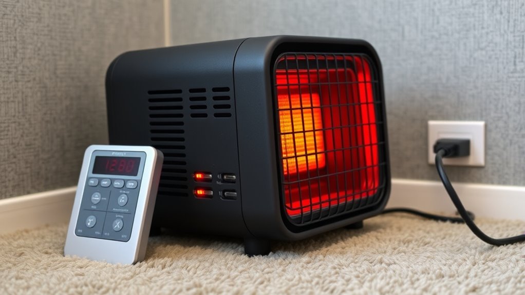 Placement is another critical factor in guaranteeing safe operation. Position your heater in a location where it won’t be obstructed by furniture or curtains, as blocked airflow can cause overheating. Keep it at least three feet away from anything combustible, and never leave it running unattended for long periods. If your heater has shutoff features—such as tip-over or overheat protection—make sure they are functional and activated. These features are designed to automatically turn off the heater if it becomes unsafe, providing an added layer of protection. Always read and follow the manufacturer’s instructions regarding placement and safety features, because improper placement can negate these safety measures.
