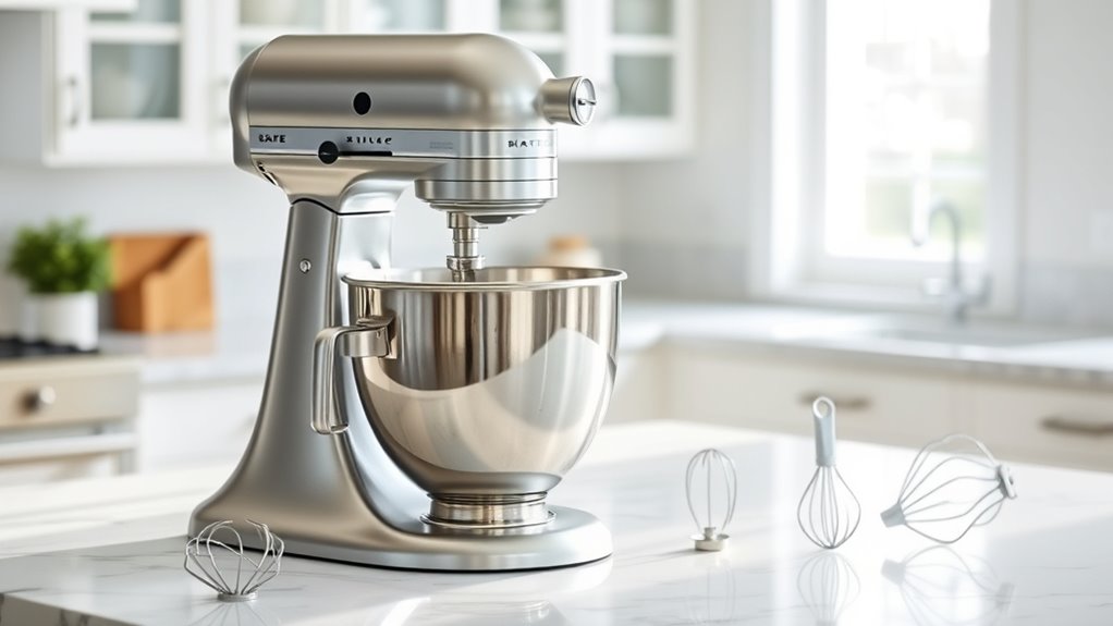 You should replace mixer attachments when they show signs of wear, damage, or become incompatible with your stand mixer. Regularly check attachment compatibility to guarantee they fit securely and work efficiently. In general, it’s wise to contemplate replacement frequency every few years or if you notice rust, cracks, or decreased performance. Doing so keeps your mixer running smoothly and extends its lifespan, ensuring safe and effective baking every time.