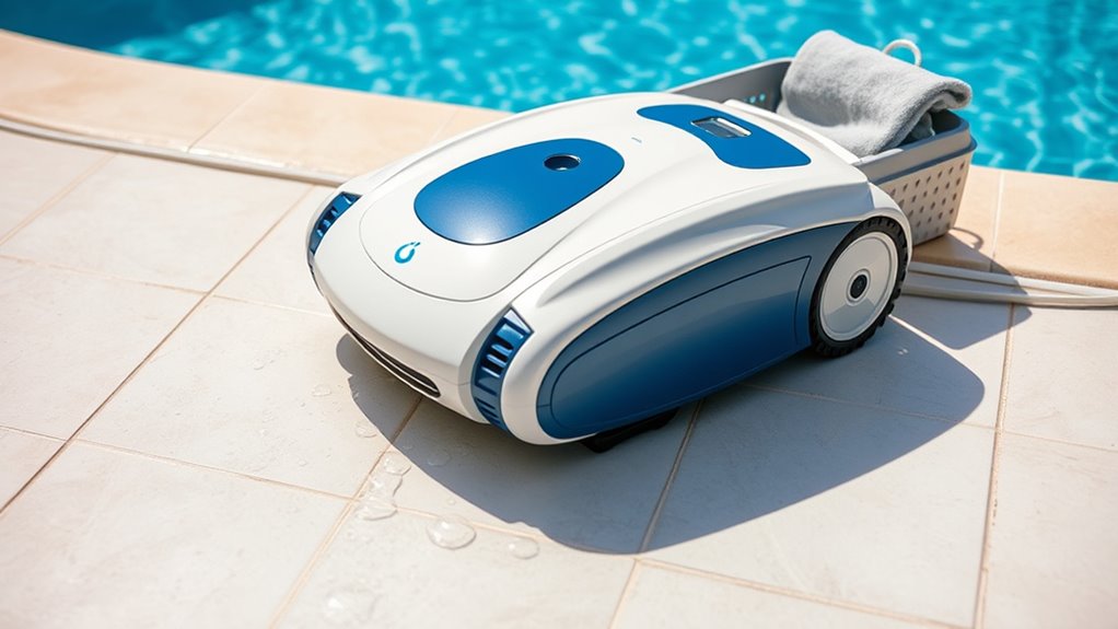 To clean and store your robotic pool cleaner, start by turning it off and removing the filter; rinse it thoroughly with a garden hose and inspect for damage. Clean the entire unit, dry it completely, and store it in a cool, dry place away from sunlight. Check the battery and terminals, disconnect and store separately if needed. Proper maintenance guarantees peak performance and longevity—explore the detailed steps to keep your cleaner in top shape.