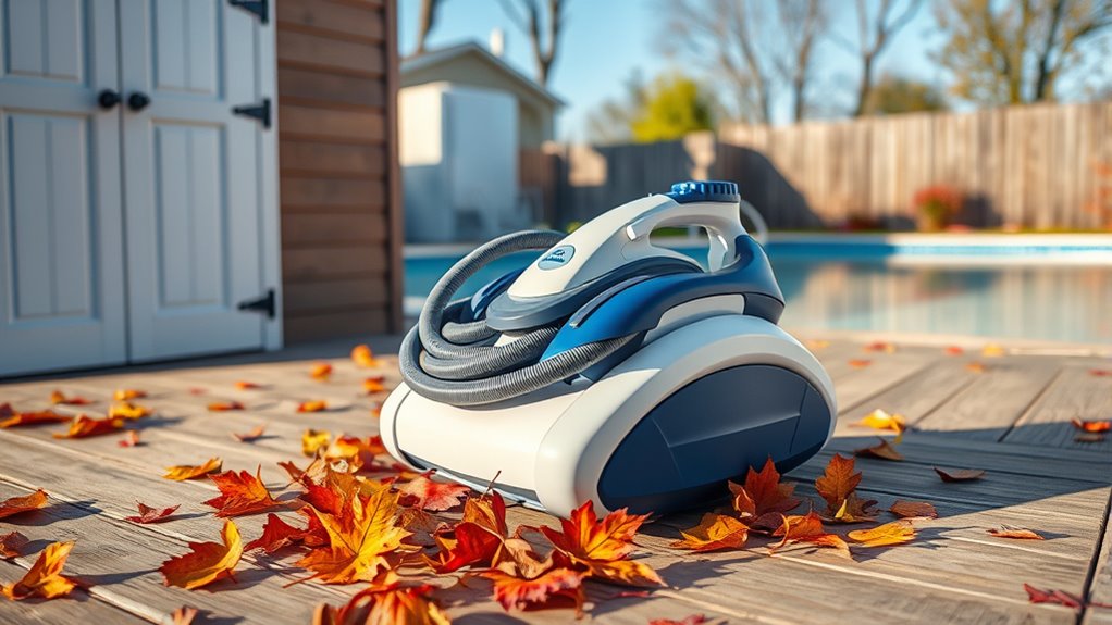 To store your suction pool cleaner properly in the off-season, start by thoroughly cleaning all parts, removing dirt, leaves, and algae. Disassemble the cleaner following the manufacturer’s instructions, then store the components in a cool, dry, and climate-controlled area away from direct sunlight. Coil hoses loosely and check for damage before storage. Ensuring all parts are dry and in good condition helps prevent mold and damage. Keep reading for detailed tips to extend your cleaner’s lifespan.