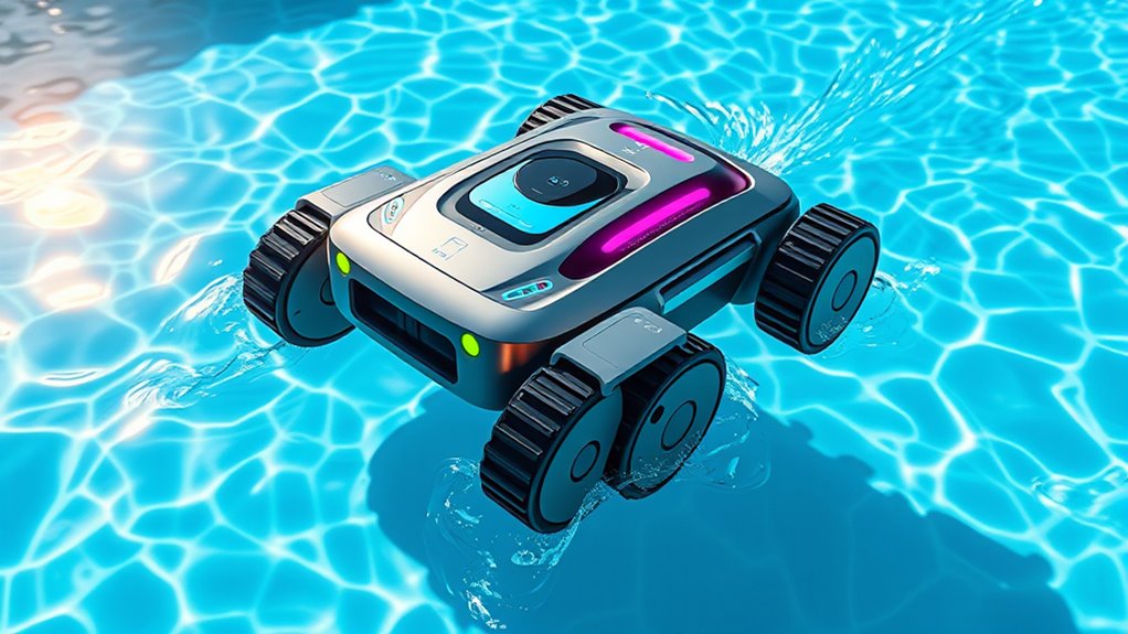 In 2025, robotic pool cleaners are more advanced with smart navigation, mapping out your pool’s layout for complete coverage. They use better sensors to detect dirt, debris, and algae, which means more efficient, targeted cleaning. These devices also focus on energy efficiency, operating during off-peak hours to save costs while being eco-friendly. If you want to discover how these innovations can transform your pool care routine, there’s more to explore below.