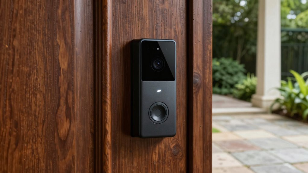 You should install your doorbell at a height that’s about 48 inches from the ground. This doorbell height guarantees you get the best camera angles, capturing clear footage of visitors and their faces. Keep in mind that placing it too high or low can compromise visibility. Proper positioning improves both security and image quality, so aim for a spot where the camera can cover the door area effectively without obstructions.