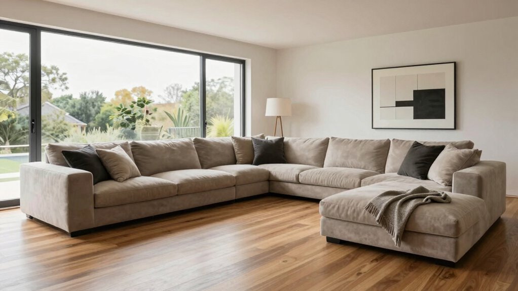 Think of modular sectionals as a Swiss Army knife, offering flexible options to fit your space, unlike fixed ones that provide solid stability but less adaptability. Modular flexibility lets you rearrange and customize your layout as your needs change, making your living room feel larger and more functional. Fixed sectionals, while stable, can limit your design choices. So, if versatility matters, modular is definitely the better choice.