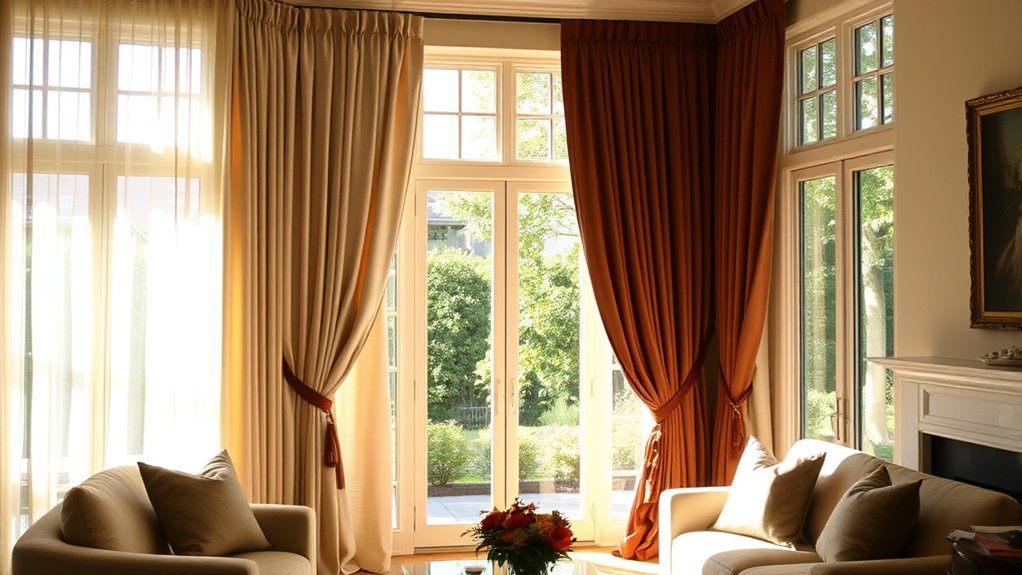 To control light, privacy, and heat, choose window treatments that match your needs. Blinds, such as wood or aluminum, offer adjustable light control and privacy while also managing temperature. Fabric curtains add style but may not block heat well, so consider insulation options like cellular shades. Proper installation and selecting inside or outside mounts can enhance performance and look. Want to learn how to pick the perfect treatment for your space? Keep exploring for expert tips.