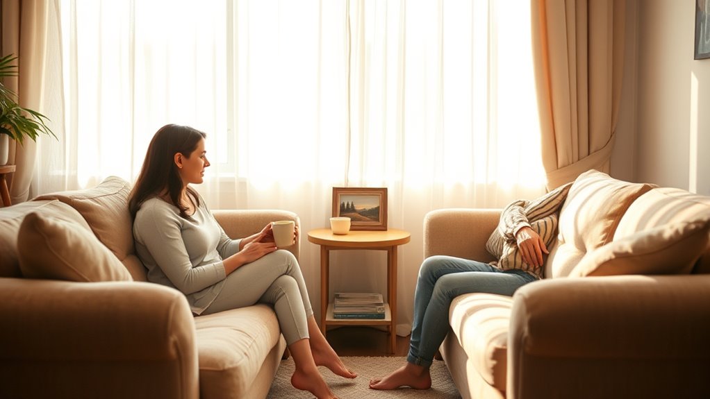 To bring up therapy without starting a fight, choose a calm moment and speak honestly about your desire for personal growth and stronger relationships. Use “I” statements and focus on positive changes rather than blame. Reassure your partner that therapy isn’t about fixing faults but improving understanding. Stay patient and listen to their concerns. If you want to learn more about approaching the topic smoothly, keep exploring strategies that foster openness and trust.
