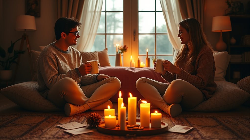 Tonight, start a simple ritual like sharing a gratitude moment or asking about each other’s highlights before bed. Turn off screens to focus on being present and create a cozy, distraction-free environment. Establish a routine, such as a nightly walk or lighting a candle during dinner, to build shared traditions. These small, intentional actions foster trust and emotional closeness. Keep it consistent, and you’ll soon notice your connection growing stronger—more ideas await to deepen your bond.