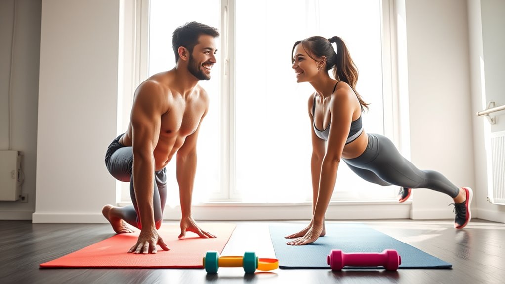 You can make workouts fun by trying partner dance or synchronized exercises together. Imagine laughing and sharing a smile as you master a new salsa move, strengthening your bond. These activities boost your connection while keeping fitness enjoyable. By incorporating playful elements like dance, you turn exercise into a shared adventure, making it easier to stay motivated and build lasting memories with your partner.