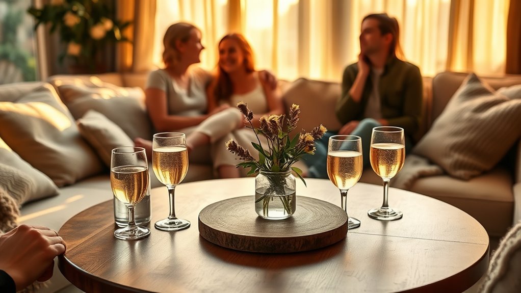 To celebrate without regret, practice mindful drinking at home by savoring each sip and setting clear intentions. Slow down, focus on flavors, aromas, and textures, and create rituals that make your moments more meaningful. Turn off screens to stay present and monitor your intake. Recognizing triggers like boredom helps you stay in control. If you keep exploring, you’ll discover more ways to enjoy celebrations with purpose and moderation.