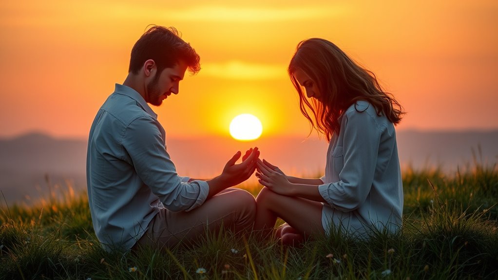 To start praying together, set aside time when you’re both relaxed and free of distractions. Overcome communication barriers by sharing your thoughts and intentions openly, creating a safe space for vulnerability. Focus on your shared spiritual goals, like gratitude or seeking guidance, to make prayer meaningful. Begin with simple prayers or silent reflection, and gradually build your routine. Consistency helps strengthen your connection and deepens your shared spiritual journey.