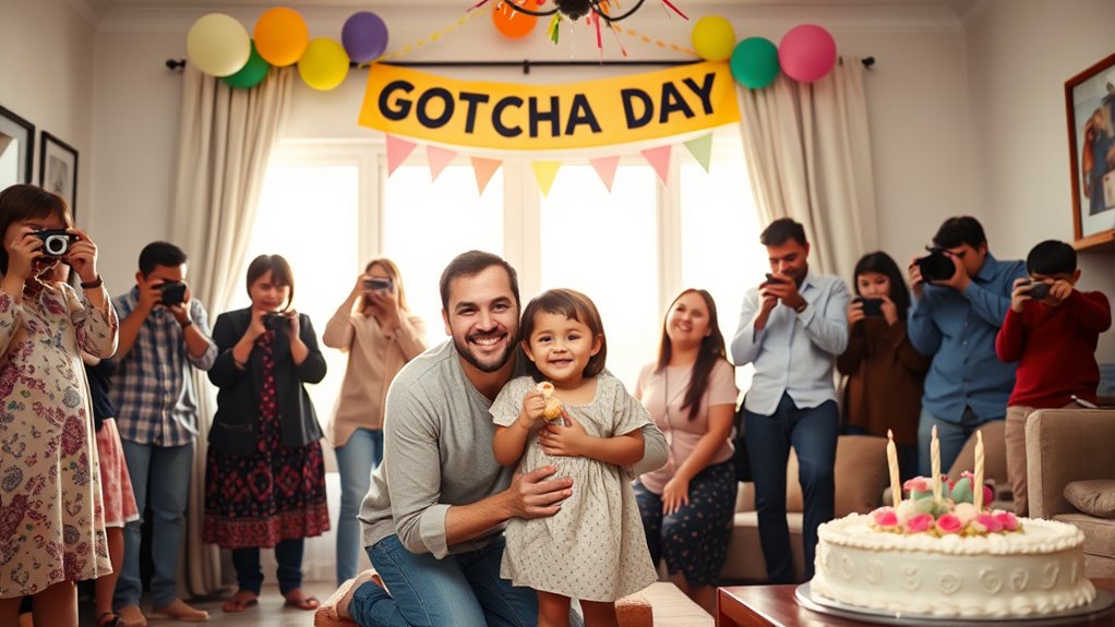 To celebrate Adoption Day or Gotcha Day, you can create meaningful traditions like lighting a special candle, sharing heartfelt stories, or making a photo timeline of your journey. You might plan a family picnic, craft personalized keepsakes, or plant a tree to symbolize growth. Involving your loved ones in special activities and giving thoughtful presents can make the day unforgettable. Keep exploring to discover even more creative ideas to honor this special occasion.