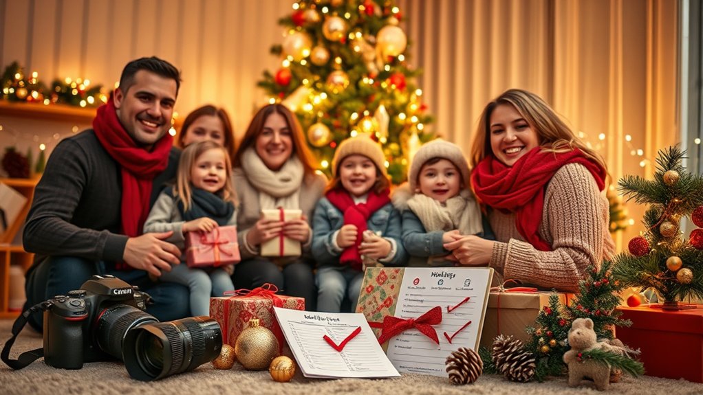 To create beautiful holiday photos, start with a checklist that includes seasonal props like cozy blankets, ornaments, and rustic signs to add festive charm. Coordinate outfits using cohesive colors and textures, and choose meaningful locations during natural light peaks for the best photos. Don’t forget essentials like batteries, snacks, and warm drinks for comfort. Keep your plan organized, and if you keep exploring, you’ll find tips to make your session even more special.