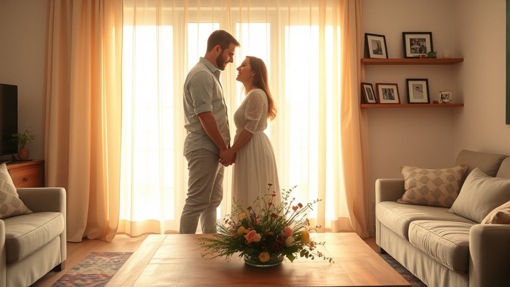 To create a simple, meaningful vow renewal at home, personalize every detail to reflect your relationship. Choose a cozy spot like your backyard or living room, and add meaningful touches like favorite songs, candles, or photos. Write heartfelt vows, incorporate small romantic gestures, and keep the atmosphere relaxed. Focus on genuine connection and making moments special. If you’re looking for more ideas to make your celebration unforgettable, there’s plenty to explore below.