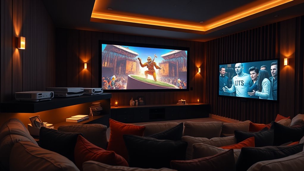 While evaluating 4K projectors for your home theater, it’s crucial to take into account the connectivity and compatibility options available. I recommend ensuring the projector supports multiple connectivity options like HDMI, USB, and audio ports for a seamless connection with various devices. Don’t overlook wireless streaming capabilities—features like WiFi 6, Bluetooth, or Miracast allow for easy screen sharing from smartphones and tablets. It’s also essential to verify compatibility with popular streaming platforms and smart ecosystems, providing direct access to your favorite content. Additionally, check for advanced audio connections, such as HDMI ARC, to integrate with sound systems. Finally, consider the number and type of input ports to future-proof your setup for different media sources and gaming consoles.