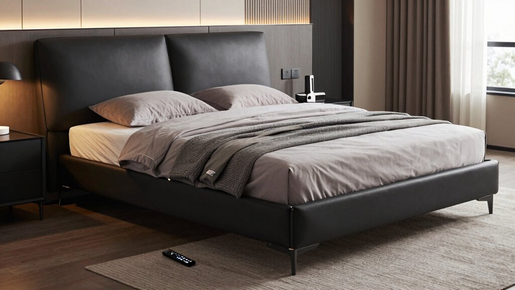 The safety features in these beds include anti-snore positions, which elevate your head to prevent airway blockages, and adjustable height limits to prevent accidental falls. Many models also have built-in sensors that alert you if there’s an obstruction or if the bed detects unusual movement. I feel reassured knowing these safety features help prevent accidents and guarantee a comfortable, secure sleeping environment for both partners.