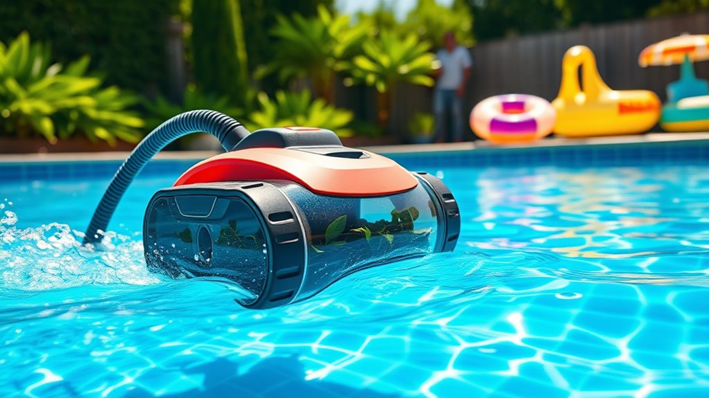The suction power of a pool cleaner is essential because it determines how effectively it can pick up dirt, debris, and fine particles from your pool’s surfaces. Strong suction ensures thorough cleaning, especially for stubborn grime and algae. Larger filter baskets or debris chambers are also vital—they let the cleaner handle more debris before needing to be emptied, maintaining consistent performance. Scrubbing brushes or rubber flaps boost cleaning efficiency by removing tough buildup on walls and floors. Efficient navigation systems, like sonar or zig-zag patterns, guarantee complete coverage, reducing missed spots and cleaning time. Finally, the ability to climb walls and waterlines is crucial for a comprehensive clean, especially in pools with vertical surfaces or algae buildup. All these factors contribute to effective, budget-friendly pool cleaning.