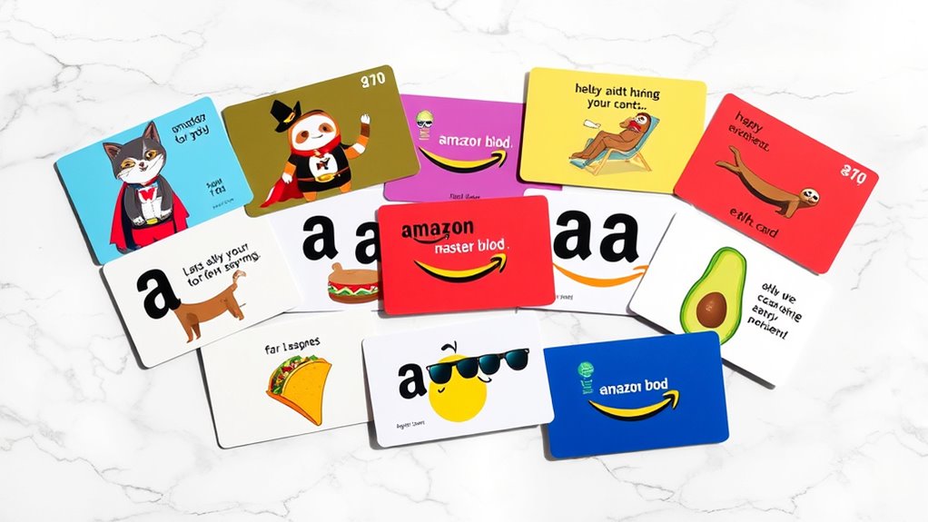 I’ve found some hilarious Amazon E-Gift Card designs that are sure to bring a smile to your loved ones. From celebration and any occasion cards to seasonal designs and printable options, each one adds a personal touch. You can even pick themes based on their humor style, like witty one-liners or playful visuals. These fun designs make gifting easy and enjoyable. Stick around; there’s more to discover about the perfect funny card for any occasion!