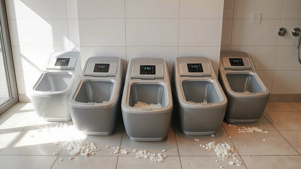 Guaranteeing safety features are in place is crucial when selecting an automatic litter box for multiple cats, as these systems need to protect pets from potential injuries during operation. Reliable safety measures like infrared and weight sensors automatically pause cleaning if a cat approaches or is inside, preventing accidents. Dual safety sensors, including motion detectors, provide extra protection by instantly stopping the cycle if a pet enters. Multi-layer safety systems, such as anti-pinch technology and automatic pausing, further safeguard pets during cleaning. Sensors that detect a cat’s presence or weight help prevent trapping or injury by halting operation immediately. Overall, these features are essential to guarantee safe, worry-free use, giving pet owners peace of mind that their cats are protected during automatic cleaning cycles.