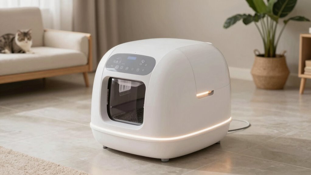 These self-cleaning litter boxes are surprisingly energy-efficient. Most models use minimal power, often comparable to a small light bulb, thanks to smart sensors and efficient motors. I’ve noticed that they run quietly and don’t substantially impact my electricity bill. Regular maintenance helps keep energy use low. Overall, I find they’re a great eco-friendly option that saves time while consuming only a fraction of the energy of traditional litter boxes.