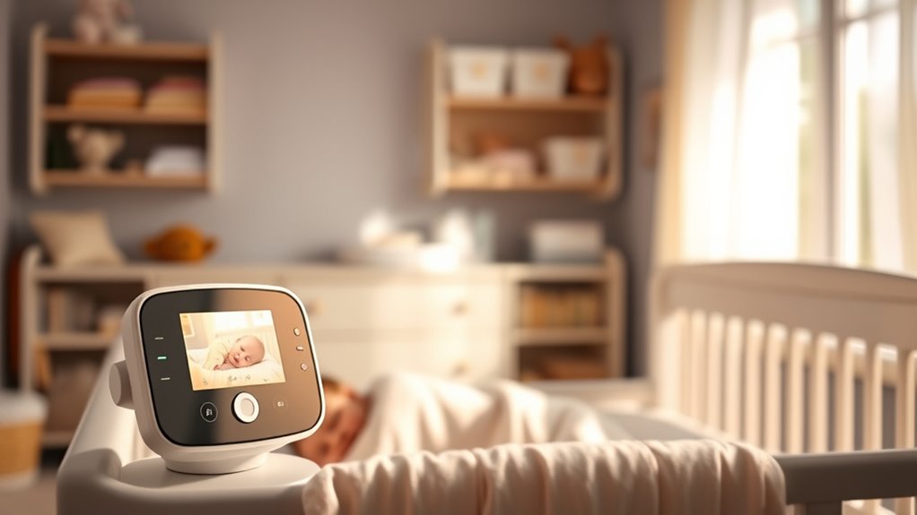 Choosing a baby monitor with excellent video quality means paying attention to several key factors. Higher resolution cameras, like 1080p or 4K, provide sharper, more detailed images, making it easier to see your baby clearly. Night vision with infrared LEDs ensures visibility in dark or low-light conditions without disturbing sleep. Optical zoom lets you focus on your little one more closely without losing image clarity, which is helpful for checking finer details. A wide viewing angle, 120° or more, covers more of the nursery, reducing blind spots and giving a better overall view. However, consistent quality depends on a stable wireless connection, as interference or weak signals can cause pixelation or lag, compromising the clarity you need for peace of mind.
