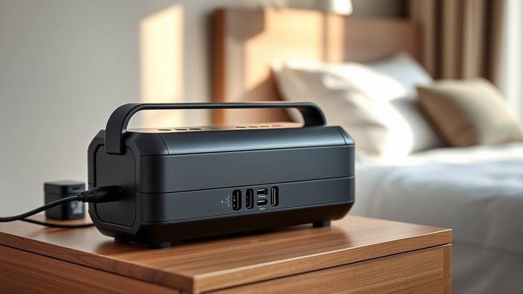 Have you considered how you’ll keep your CPAP powered while on the go? When choosing a battery backup, it’s essential to look at its charging options. A versatile model should support multiple methods like AC wall outlets, USB-C PD, car cigarette lighter, and even solar panels for maximum flexibility. Check how long it takes to recharge—many batteries need 2 to 6 hours depending on the method. Also, verify that the power supply includes the right cables or adapters for your specific CPAP model, ensuring seamless charging. If you travel by air, confirm the battery’s compatibility with airline regulations to prevent issues during security checks. ultimately, a pass-through charging feature is a bonus, letting you charge the battery while powering your CPAP for uninterrupted use.
