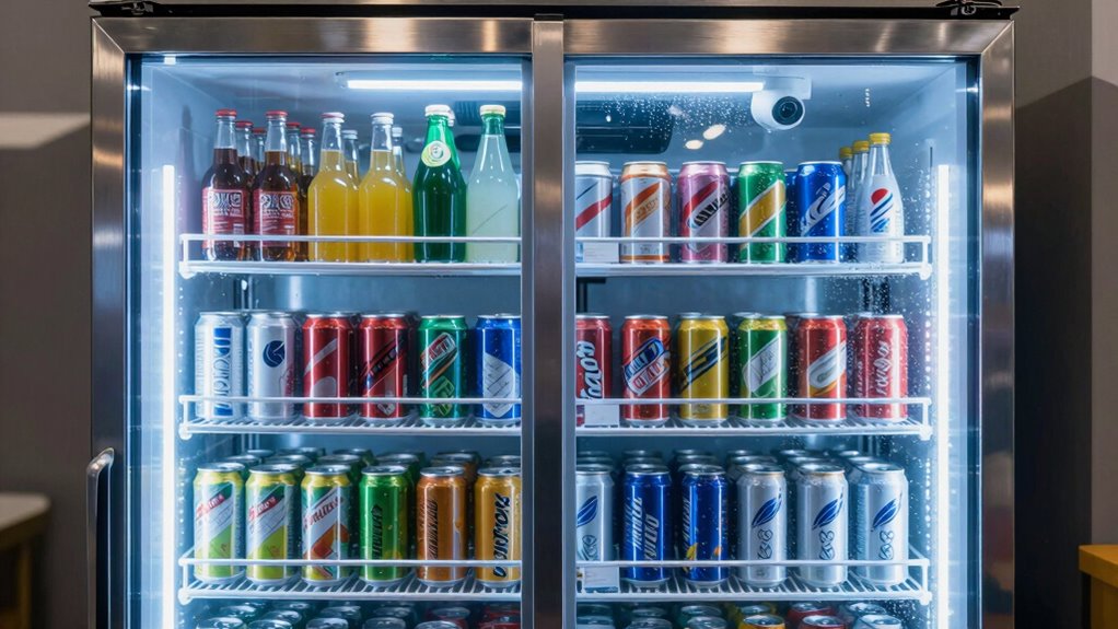 Think of UV-resistant glass doors as sunglasses for your beverages. They block harmful rays that can degrade flavors and quality over time. I’ve seen drinks spoil prematurely because of unprotected sunlight, but with UV-resistant glass, I noticed my sodas stayed crisp and fresh much longer. These doors safeguard your drinks from UV damage, ensuring ideal preservation and taste, much like shielding your eyes from the sun’s harsh glare.