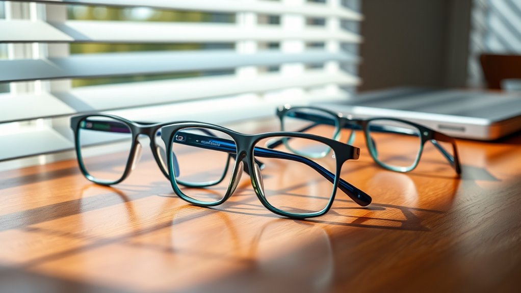 When selecting blue light glasses, the materials used for the frames and lenses are key to guaranteeing they last through daily wear. I look for frames made from flexible, durable materials like TR90, polycarbonate, or nylon because they resist breakage and withstand daily handling. High-quality lenses, such as those with scratch-resistant polycarbonate or HD coatings, help maintain clarity and prevent damage over time. Lightweight yet sturdy frames provide comfort without sacrificing strength, making them ideal for all-day use. The construction of hinges also matters—metal hinges tend to last longer than plastic ones. Proper care, such as regular cleaning and storing in protective cases, further extends the life of my glasses. Choosing the right materials ensures durability and long-lasting protection.