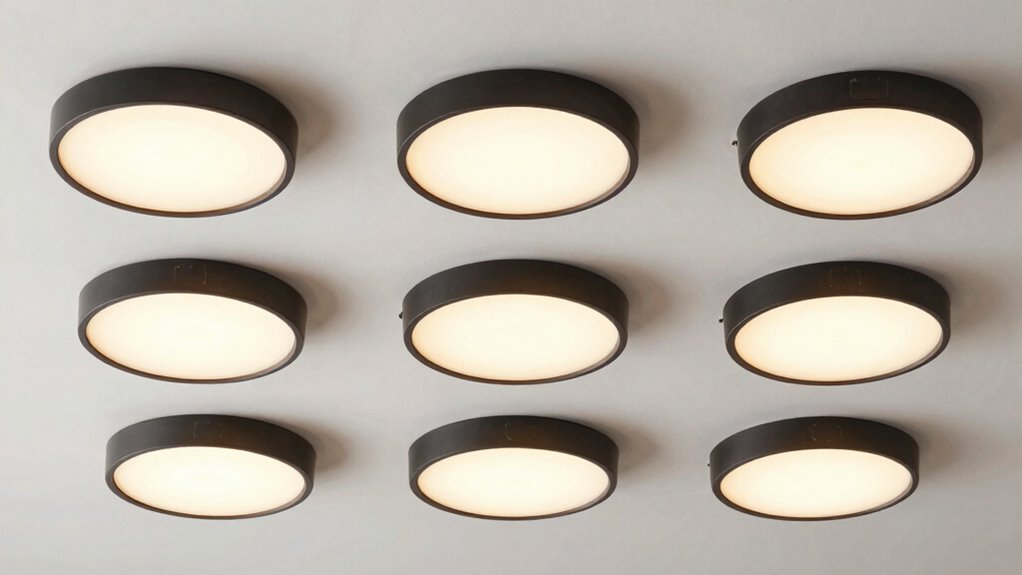 Budget considerations play a crucial role in choosing the right modern flush mount ceiling light, as prices can range from affordable models around $50 to high-end designs exceeding $200. It’s important to determine your budget early to narrow down options and avoid overspending. Keep in mind that installation costs, especially if professional help is needed, can add to your overall expenses. Balancing features like dimming, adjustable color temperature, and energy efficiency with your budget is key. Investing in higher-quality fixtures might cost more upfront but often results in better durability, a longer lifespan, and lower maintenance costs over time. Additionally, set aside funds for accessories or compatible dimmers if required, ensuring your fixture functions efficiently and meets your lighting needs.