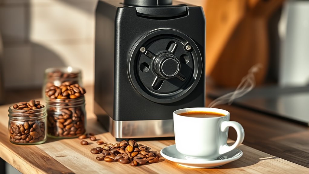 Since durability and material quality directly impact a coffee grinder’s lifespan, it’s important to focus on these aspects when shopping under $100. High-quality grinders often use sturdy materials like stainless steel, ceramic burrs, or reinforced plastic, which can withstand frequent use. Metal components, especially burrs, tend to last longer and stay sharp, ensuring consistent grind size over time. A robust housing and reinforced internal parts also help prevent damage from accidental drops or heavy use, extending the grinder’s life. Material quality doesn’t just affect durability; it influences grind consistency as well. Well-made burrs or blades maintain their sharpness longer, resulting in uniform grounds. Regular cleaning and gentle handling further preserve the material integrity, keeping your grinder performing well for years.