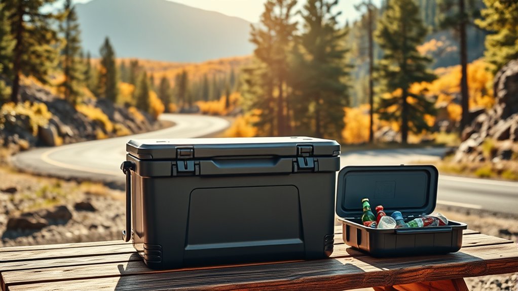 Selecting a cooler that’s easy to carry and maneuver can make your road trip much more enjoyable. Look for models with sturdy wheels and telescoping handles, which make rolling over different terrains simple. Lightweight designs with ergonomic handles or straps help reduce fatigue when carrying or lifting the cooler. Versatile options like built-in handles, shoulder straps, or backpack straps give you multiple ways to transport it comfortably. Be mindful of the cooler’s size and weight, ensuring it’s manageable for your needs without sacrificing capacity. Additionally, foldable or collapsible coolers are great for saving space when not in use. These portability features help you move your cooler effortlessly, so you can focus on enjoying your trip rather than struggling with bulky gear.