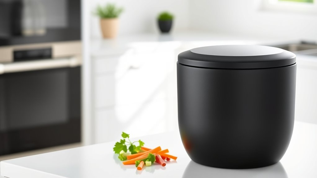 Effective odor control is essential for keeping your countertop compost bin a pleasant addition to your kitchen. Features like activated charcoal filters, airtight seals, and ventilation holes work together to trap and neutralize smells. Regularly replacing or maintaining filters—usually every 3 to 4 months—ensures continued odor absorption. Sealed lids and tight-fitting covers prevent odors from escaping even when the bin is full. Some models include dual-filter systems or high-capacity carbon filters for enhanced odor neutralization. Proper airflow management is also vital, so look for bins with vented lids or filters that help reduce moisture buildup, which can cause foul smells and mold. These features keep your composting process clean, fresh, and odor-free.