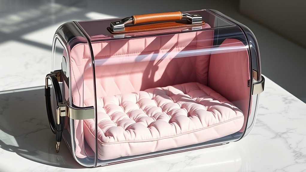 Durability plays a crucial role in selecting a designer pet carrier that can withstand daily wear and travel stresses. High-quality materials like vegan leather, waterproof fabrics, or reinforced Oxford cloth ensure the carrier lasts through frequent use. The outer surface should resist fading, deformation, and tearing to keep its stylish appearance intact over time. Reinforced stitching and sturdy hardware such as alloy zippers and metal fasteners greatly boost longevity. Additionally, breathable mesh panels and ventilation openings must be securely integrated to prevent fraying and damage from pet claws. Choosing carriers with tear-resistant mesh and abrasion-proof surfaces guarantees they remain functional and attractive even with rough handling or outdoor conditions. Investing in durable materials guarantees your carrier stays stylish and reliable for years to come.