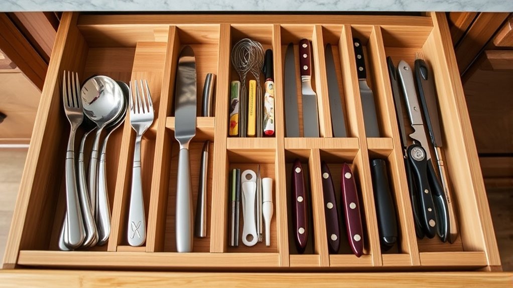 To prevent drawer dividers from slipping, I make sure to choose ones with non-slip grips or rubber pads on the bottom. I also secure them tightly by adjusting their size to fit snugly in the drawer. Sometimes, I add a bit of double-sided tape underneath for extra grip. Regularly checking and adjusting them keeps my organization intact, ensuring everything stays in place without sliding around.