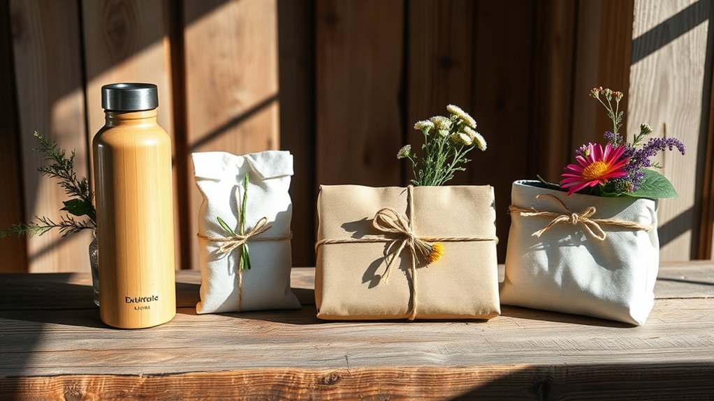 While selecting eco-friendly gifts, I always prioritize durability and longevity to make certain that my choices stand the test of time. I look for gifts made from sustainable materials like bamboo, recycled leather, or reclaimed wood, as they often have longer lifespans. The quality of craftsmanship plays a huge role too; well-made items resist wear and environmental degradation. I’m drawn to gifts with reinforced construction, like double-stitching and sturdy hardware, as they can handle daily use. Versatile, multi-functional gifts also catch my eye, ensuring they stay relevant for years. Finally, I consider proper care and maintenance, as these factors profoundly influence the gift’s durability and sustained eco-friendliness, making them truly worthwhile investments.